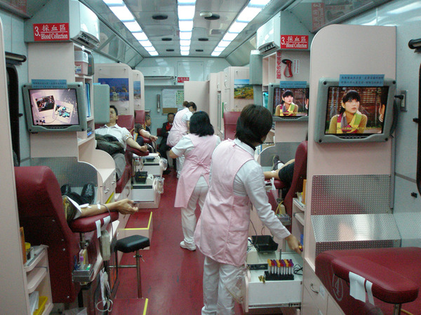 捐血車內光潔明亮,設備新...