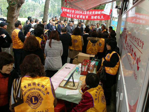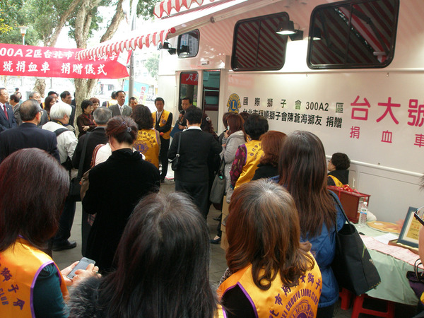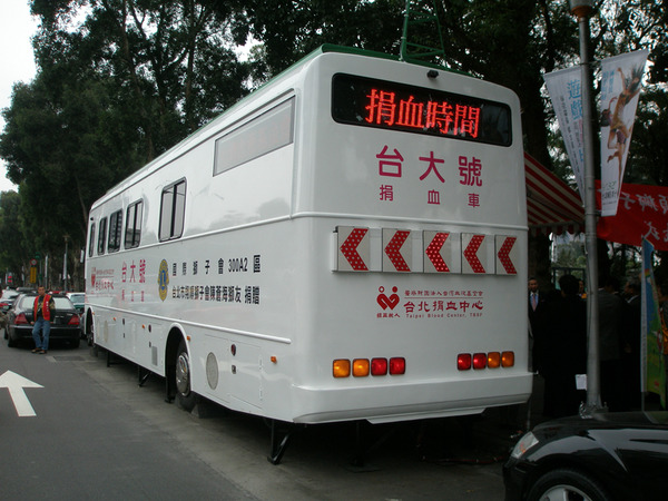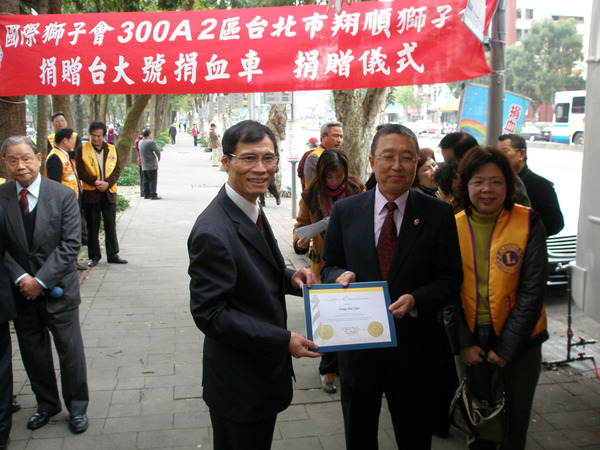 台大號捐血車已運轉十年了,累積愛心捐血超過四十萬袋,該車亦是翔順獅子會陳蒼海獅兄捐贈,此次完全更新,共耗資新台幣240萬元,為能作更好的服務,設備新穎,效率更高. 筆者發覺一個小秘密,3/16正逢陳獅嫂黃麗珍獅姊生日,陳獅兄鐵漢柔情,夫妻情深,真是獅子會的表率.